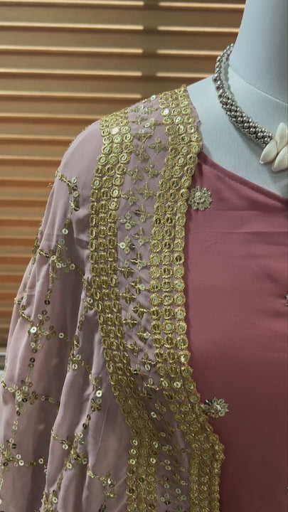 This peach pink lehenga with top and dupatta is designed for women who love soft pastel tones blended with refined traditional detailing. The soothing peach pink shade brings a graceful and feminine charm, while the heavy 5mm embroidery sequin work adds festive richness without overpowering the look.